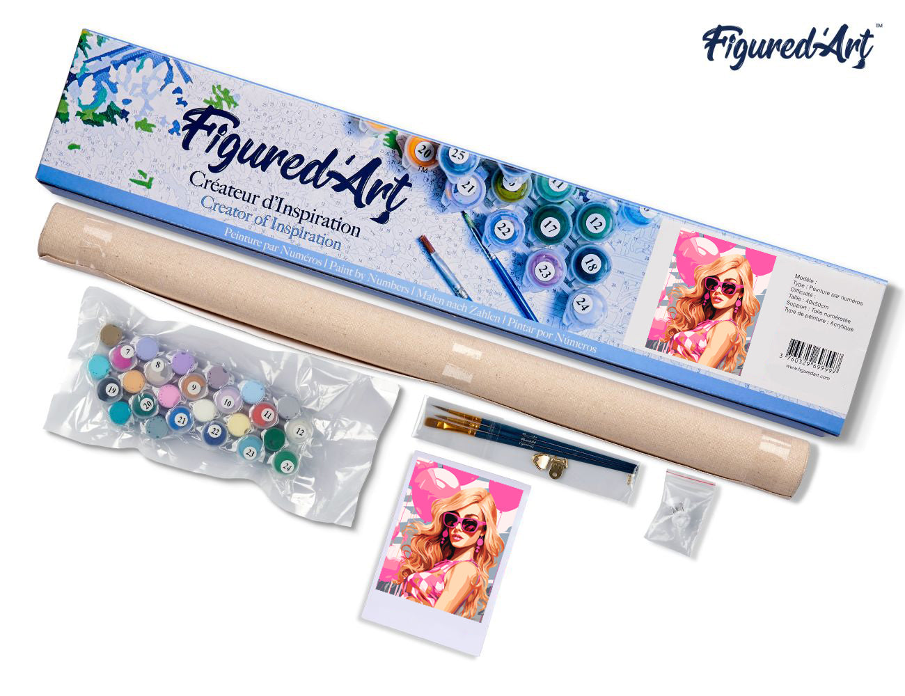Le kit contient une toile en lin numérotée en 40 x 50 cm, des peintures acryliques et des pinceaux. Niveau intermédiaire : accessible, tout en laissant le plaisir du détail. Tout est prêt, il ne reste qu’à vous lancer.