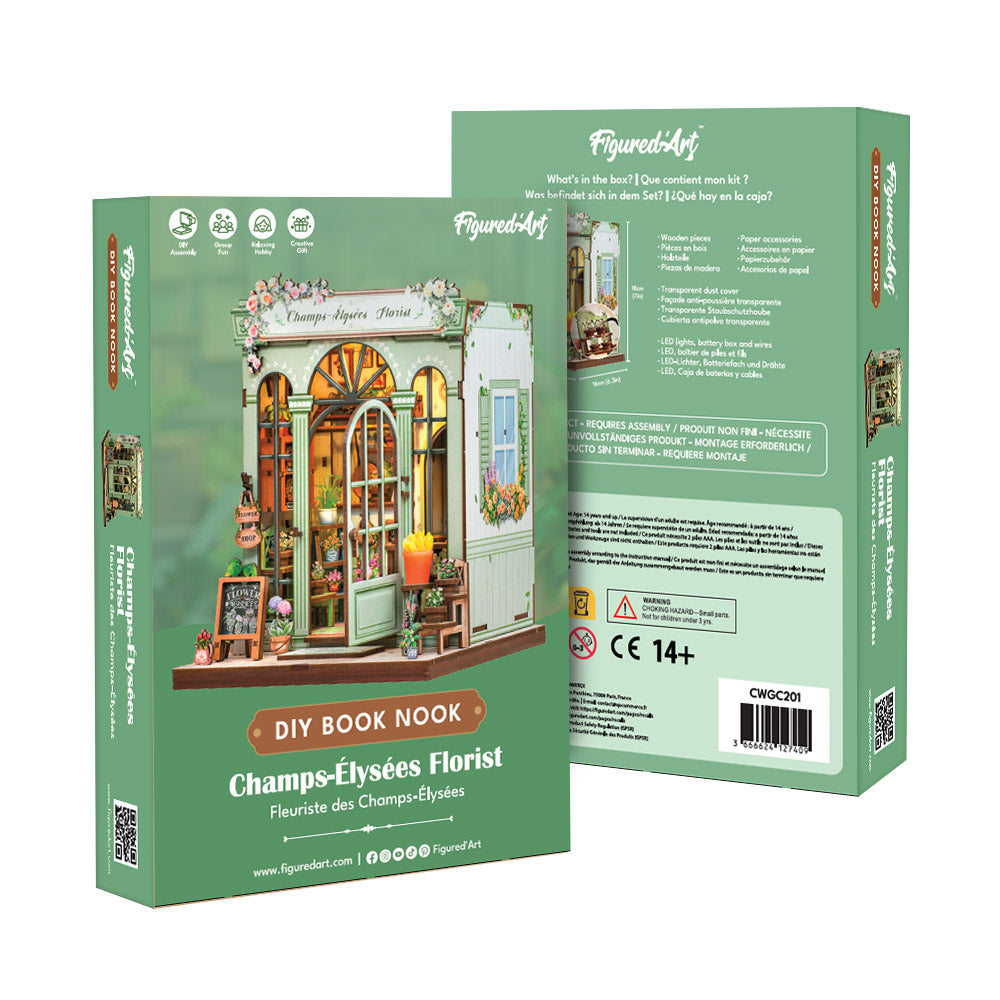 Imaginez une petite boutique de fleurs nichée entre deux romans. En ouvrant la boîte, vous découvrez chaque détail du book nook Fleuriste des Champs-Élysées : vitrines délicates, compositions florales miniatures et lumière douce qui réchauffe l’ensemble.