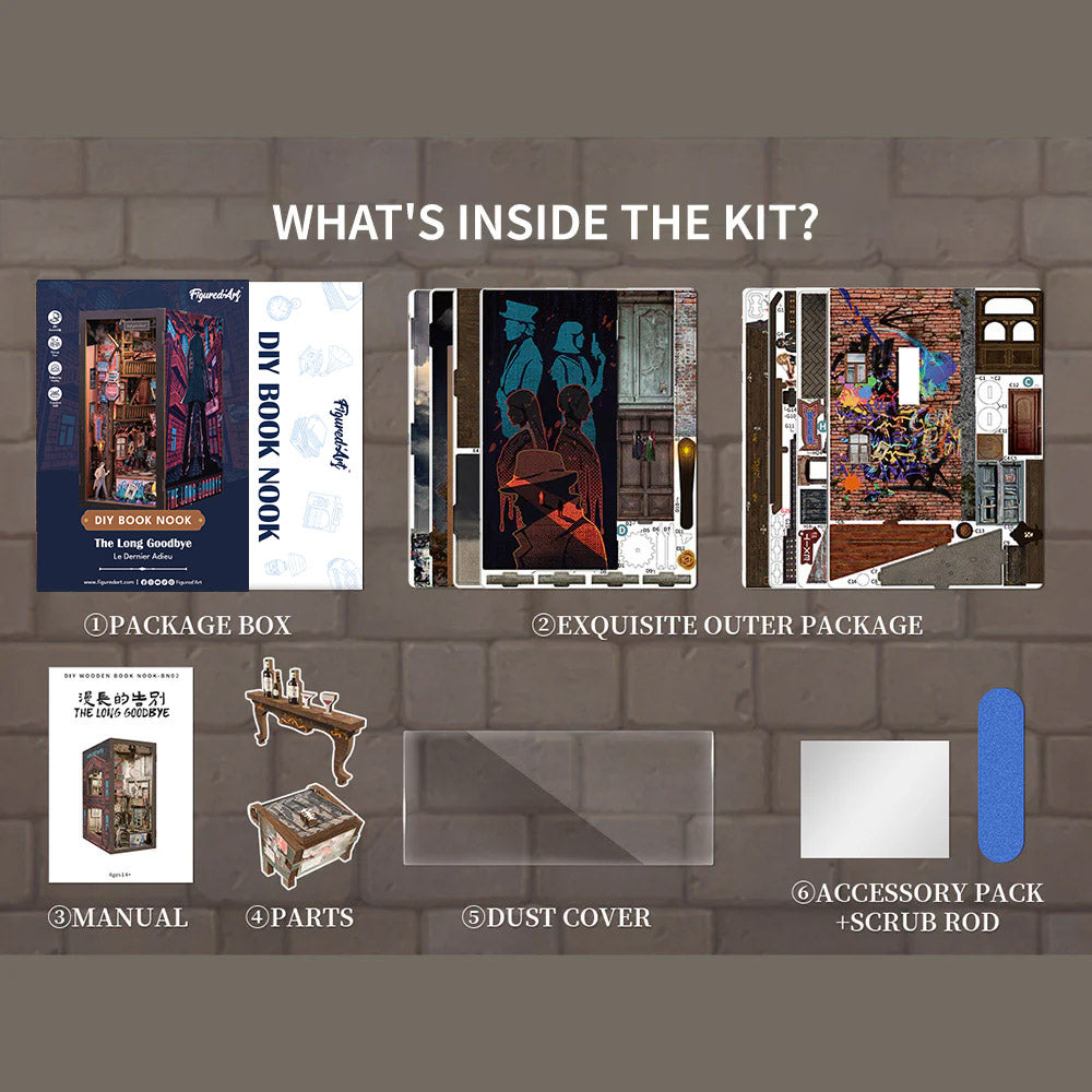 Book Nook Le Dernier Adieu vous invite à créer une ruelle mystérieuse façon film noir, à glisser entre vos livres. Chaque détail prend vie sous vos doigts, pour un décor miniature qui attire le regard et raconte une histoire.