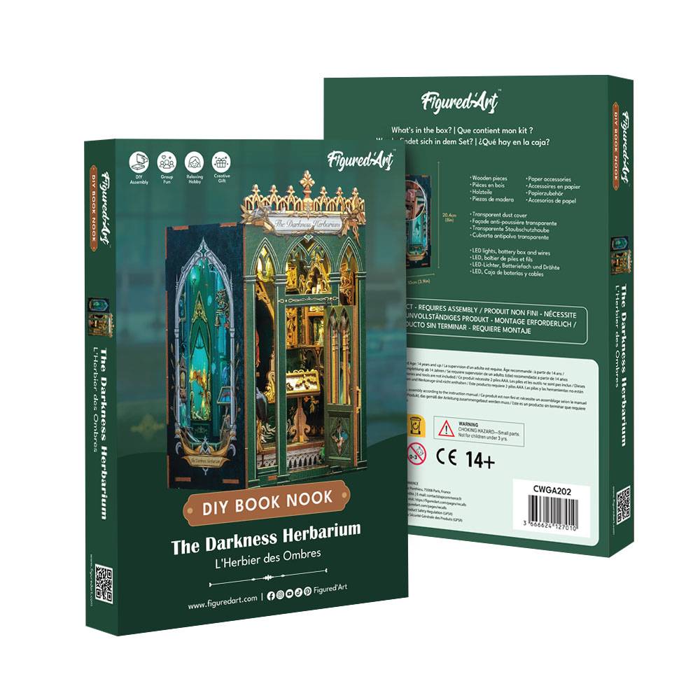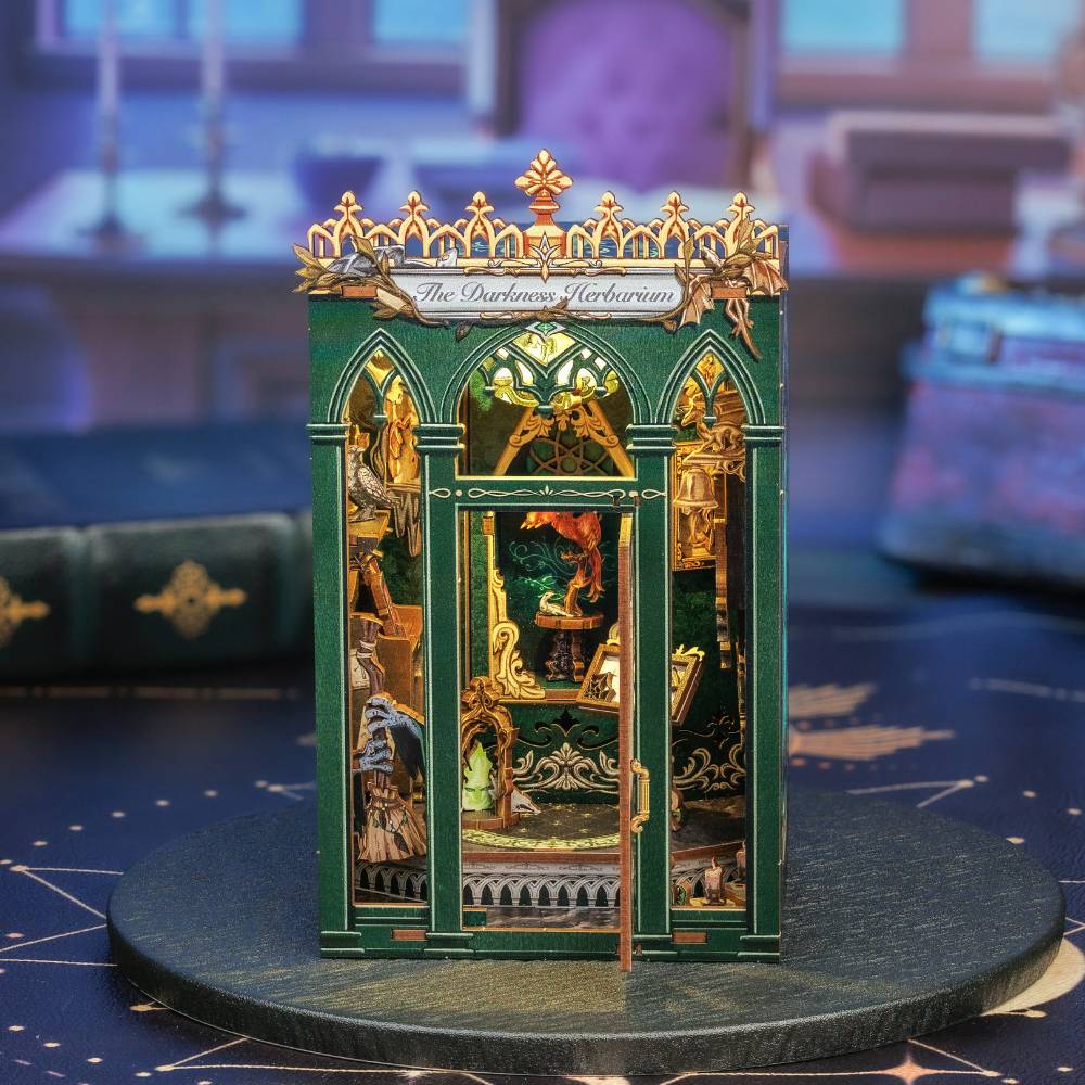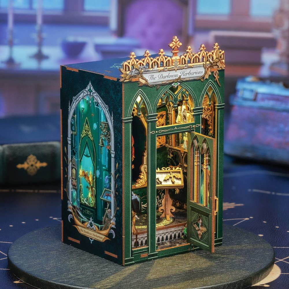 Imaginez ouvrir votre bibliothèque et découvrir, niché entre deux romans, un book nook baigné de lumière douce. L’Herbier des Ombres évoque un pavillon silencieux, rempli de plantes étranges et de détails dorés qui attirent le regard et invitent à la contemplation.