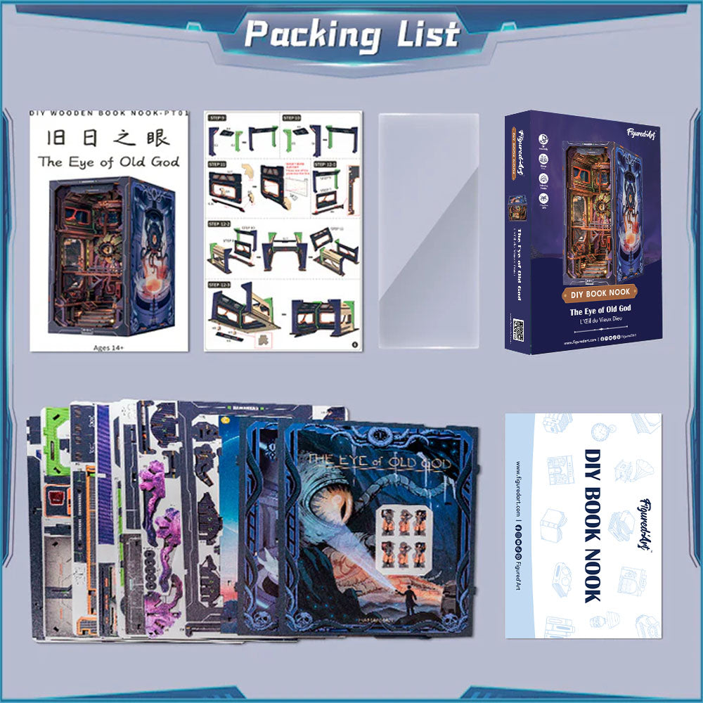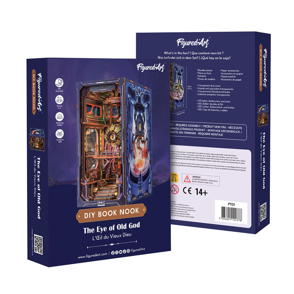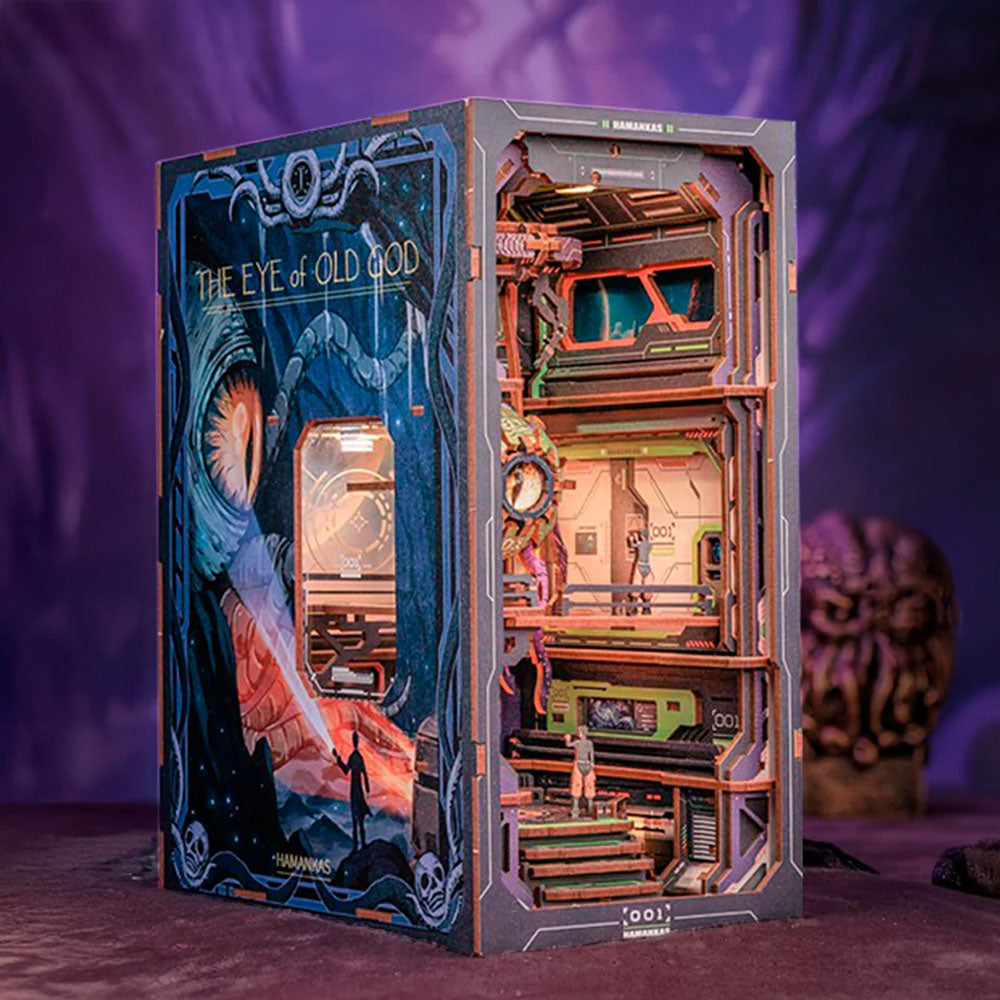 En ouvrant la boîte, vous plongez dans un univers sombre et fascinant. Caverne secrète, créature à l’œil géant, base souterraine illuminée… chaque élément du book nook L’Œil du Vieux Dieu se révèle au fil de l’assemblage.