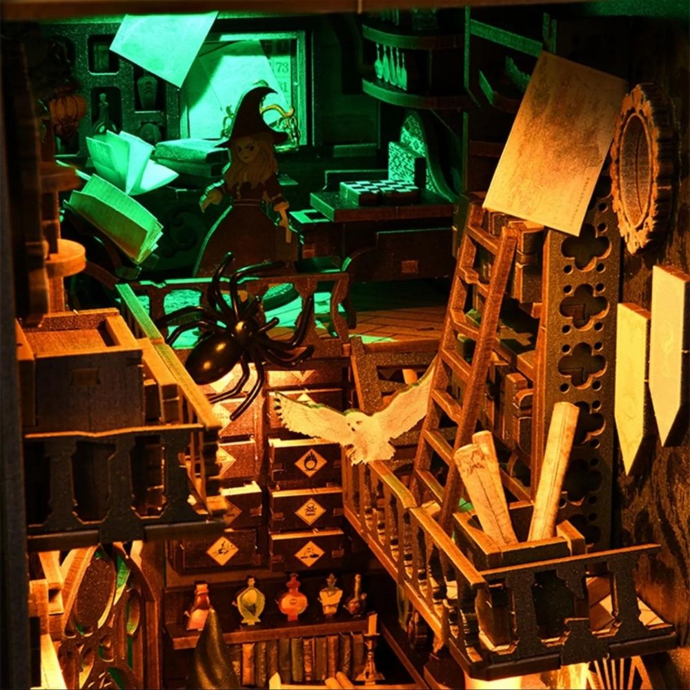 Book Nook Maison du Sorcier : glissez un atelier mystérieux entre vos livres et transformez votre étagère en scène magique. Chaque détail prend vie grâce aux éléments miniatures et à l’éclairage LED intégré.