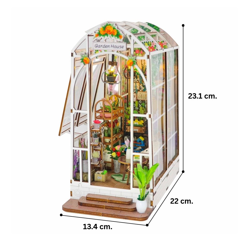 Vous ouvrez la boîte, les pièces s’alignent, et peu à peu ce book nook devient une véritable serre en réduction. La lumière douce révèle les étagères fleuries, le petit mobilier et cette atmosphère calme qui invite à ralentir.