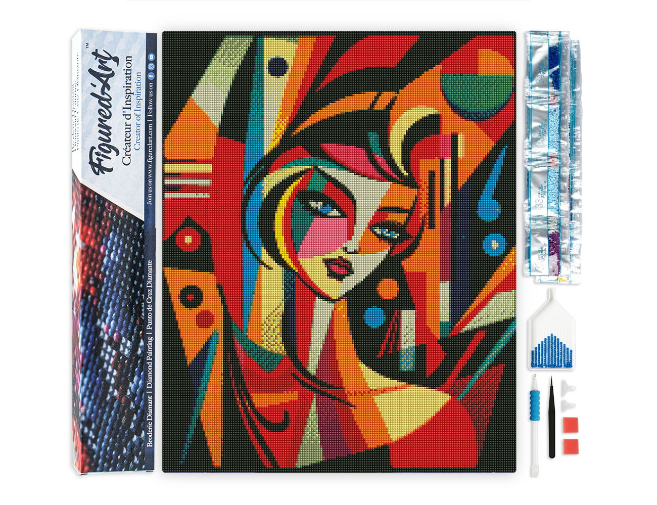 Vous ouvrez le kit, la toile se dévoile, les lignes abstraites dessinent peu à peu un visage féminin inspiré de l’art moderne. Chaque diamant posé révèle une nuance, une émotion, une vibration graphique.