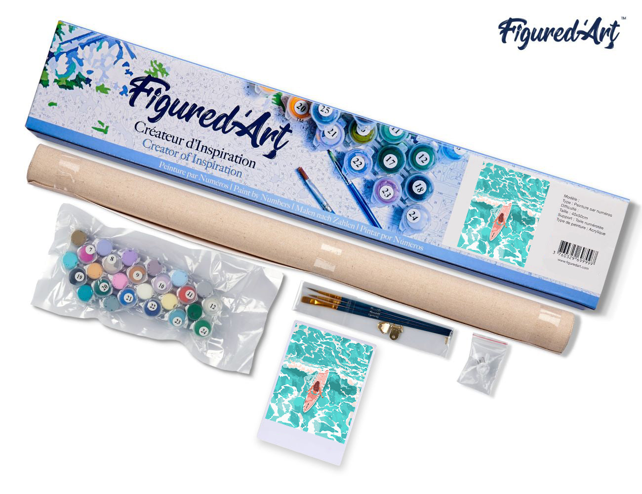 La toile roulée est en lin numéroté au format 40 x 50 cm. Le kit de peinture par numéros comprend les pots de peinture acrylique numérotés, trois pinceaux en nylon de tailles différentes, une photo miniature de l’œuvre pour vous guider, ainsi que deux vis et deux crochets pour l’accrochage. Tout est prêt, il ne reste qu’à vous lancer.