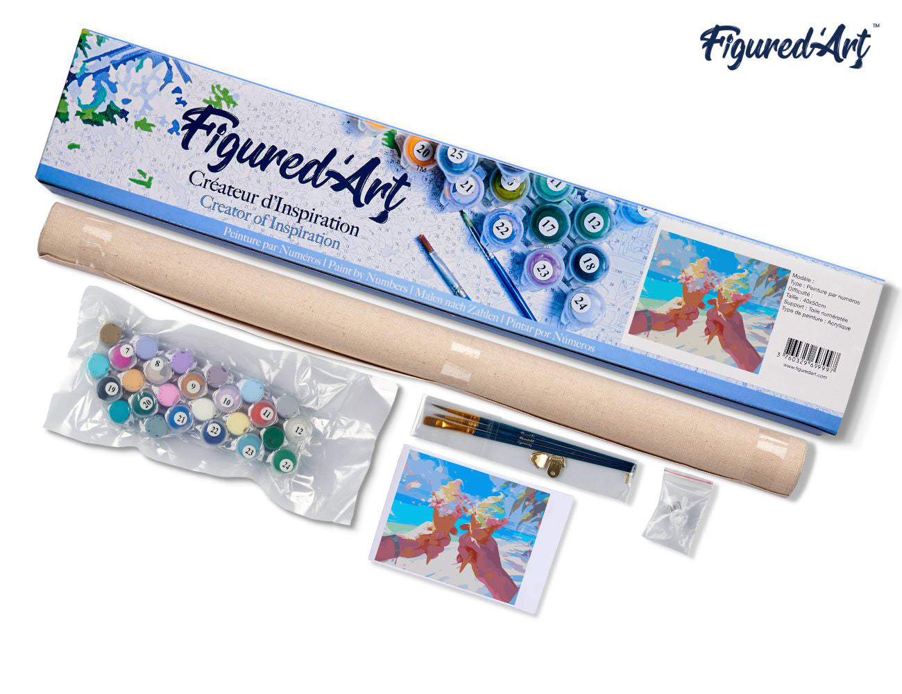 Le kit comprend une toile en lin numérotée de 40 x 50 cm, des peintures acryliques numérotées, trois pinceaux de tailles différentes, une photo miniature de référence et le nécessaire pour l’accrochage mural. Tout est prêt, il ne reste qu’à vous lancer.