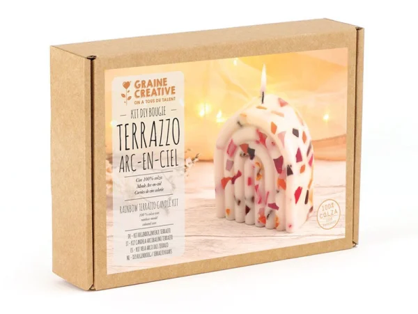 Vous ouvrez la boîte, les couleurs apparaissent. Les carrés de cire se déposent, se mélangent, et l’effet terrazzo prend vie sans jamais se répéter. Chaque bougie devient un petit paysage coloré, façonné à la maison, à votre rythme.