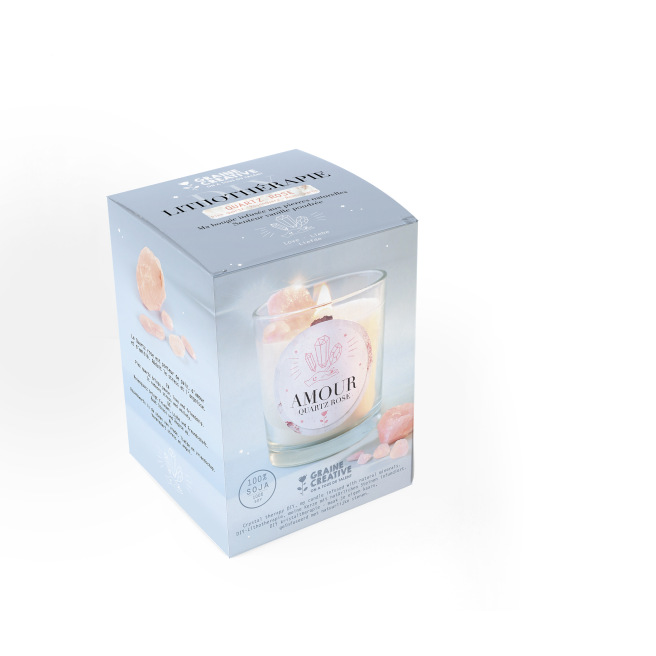 Vous ouvrez le coffret, la table se transforme en petit atelier, et l’odeur subtile de la cire de soja commence déjà à installer l’ambiance. Ce kit bougie maison vous invite à ralentir et à créer une pièce unique, décorée de quartz rose soigneusement disposés sur le dessus.