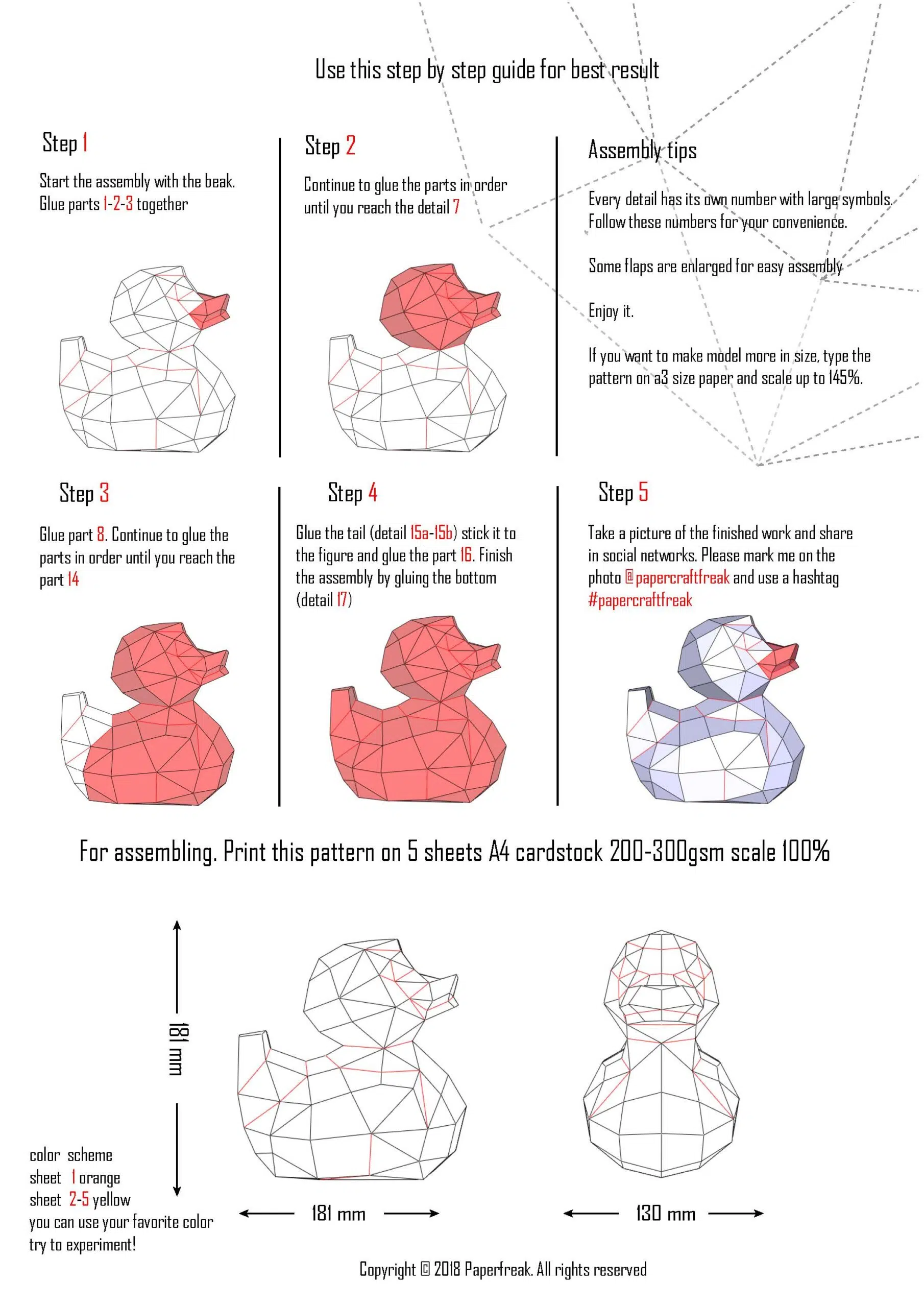 Une fois assemblé, le canard mesure 181 mm de hauteur, 130 mm de largeur et 181 mm de profondeur. Le patron se compose de 5 feuilles imprimées, pensées pour guider l’assemblage avec précision.