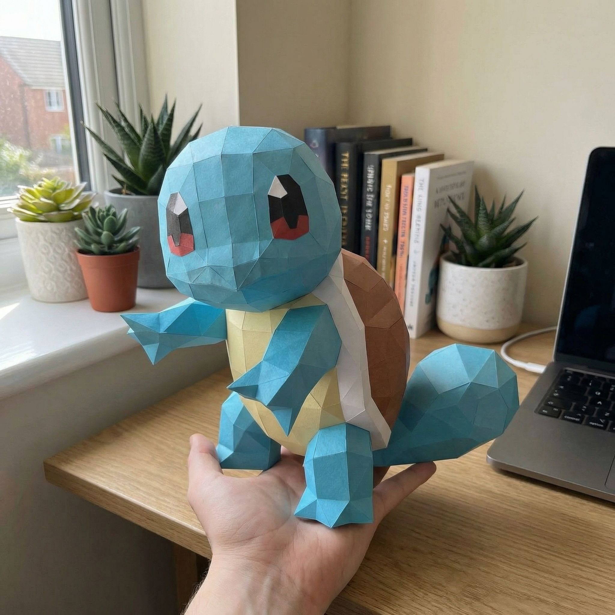 Sur la table, une feuille imprimée. Puis une autre. Les plis s’enchaînent, la carapace apparaît, le regard se dessine. En quelques étapes, Carapuce quitte le papier pour devenir une figurine à exposer fièrement.