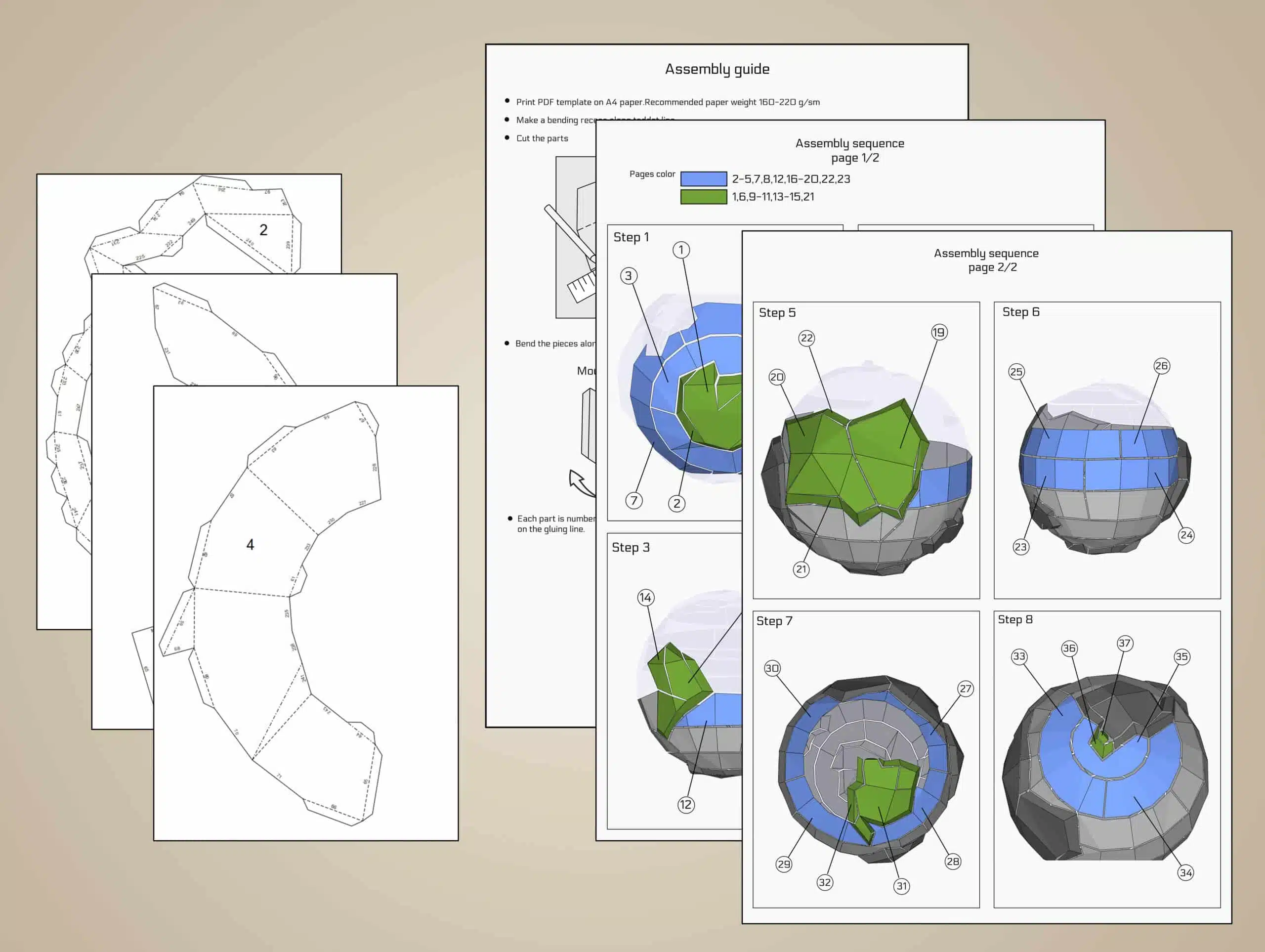 Le modèle final forme une sphère de 340 mm de hauteur, largeur et profondeur. Le kit comprend 23 feuilles imprimées, pensées pour offrir un beau relief et une lecture fluide du globe une fois assemblé.
