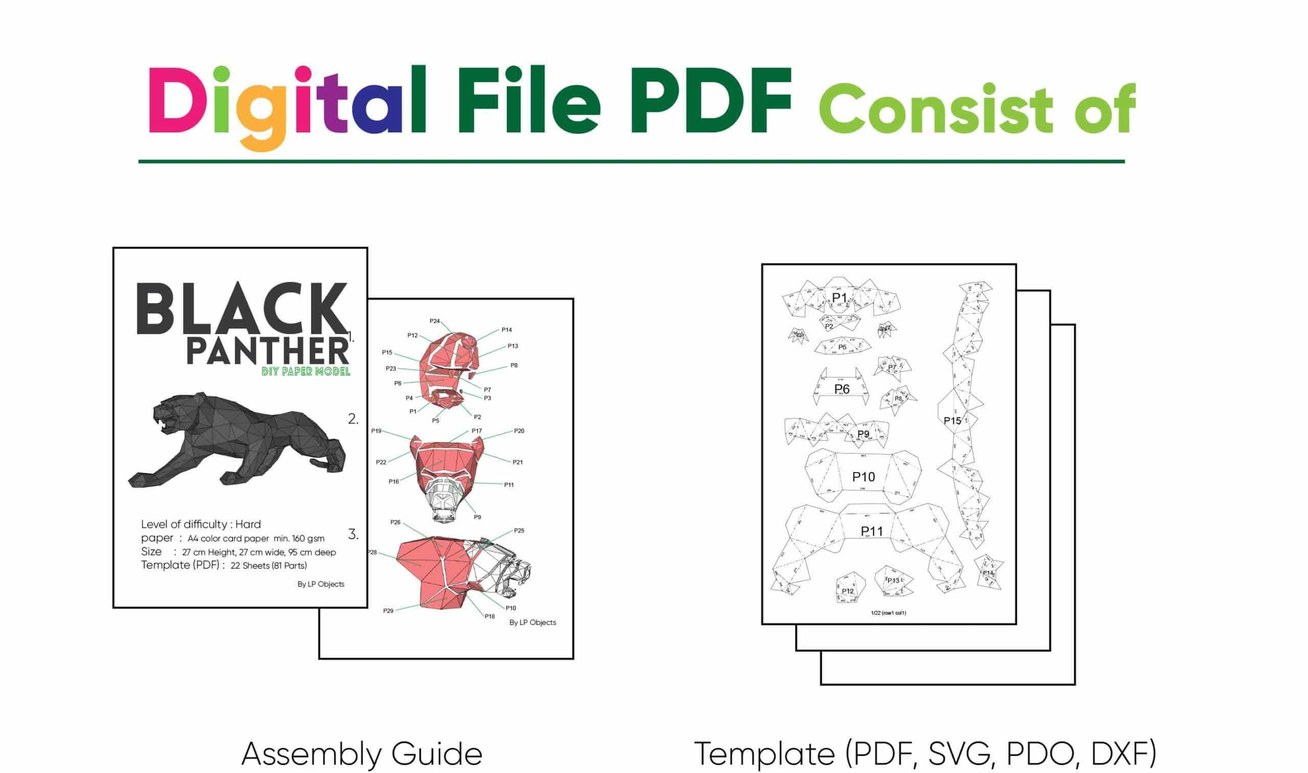 Une fois assemblée, la panthère affiche des dimensions généreuses : 270 mm de hauteur, 270 mm de largeur et 950 mm de profondeur. Le modèle se compose de 81 pièces réparties sur 22 feuilles imprimées.