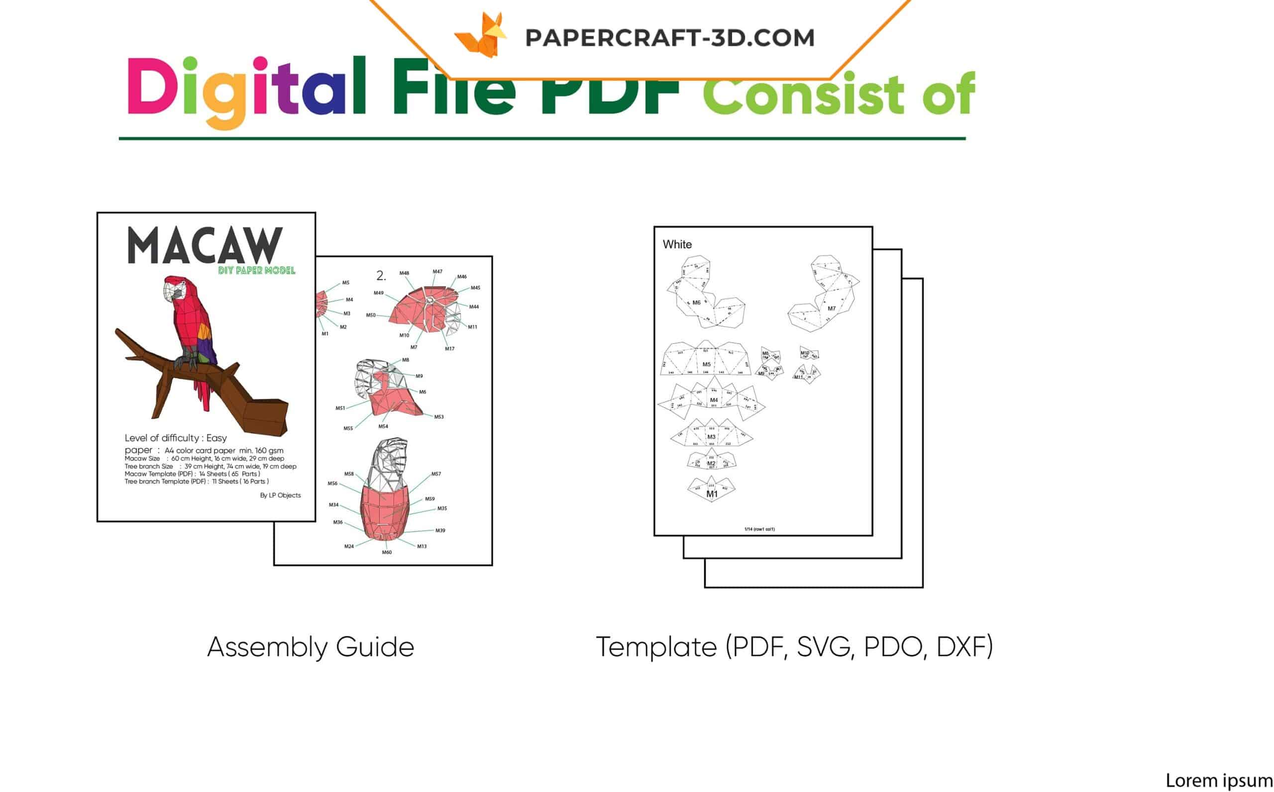 Le kit est complet et prêt à l’emploi : 25 feuilles imprimées au total (14 pour le perroquet, 11 pour la branche), soit 81 pièces. Tout est fourni : il n’y a plus qu’à découper, plier et coller. Les feuilles sont imprimées sur un papier français de qualité Clairefontaine, stable dans le temps, respectueux des couleurs et issu de sources éco‑responsables.