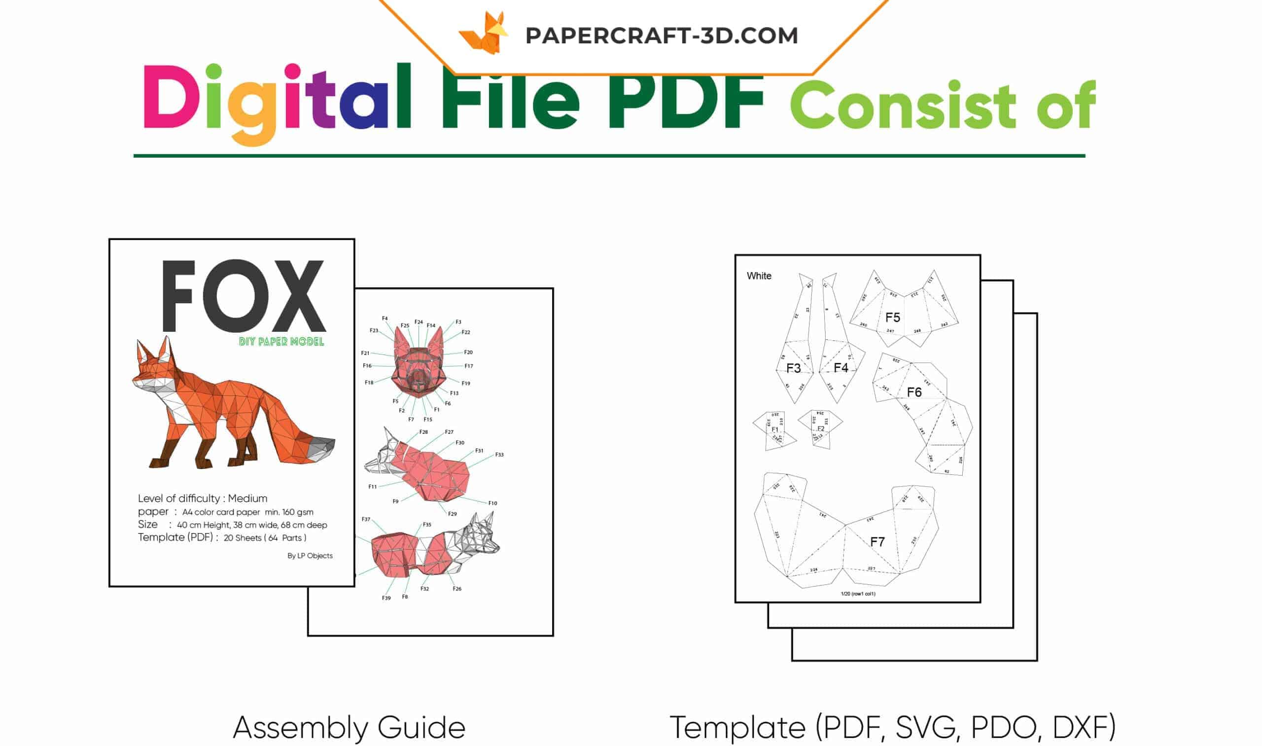 Le kit comprend 20 feuilles imprimées regroupant 64 pièces. Tout est prêt : feuilles, repères et ajustements. Il suffit de découper, plier et coller pour voir la démarche du renard se dessiner naturellement.