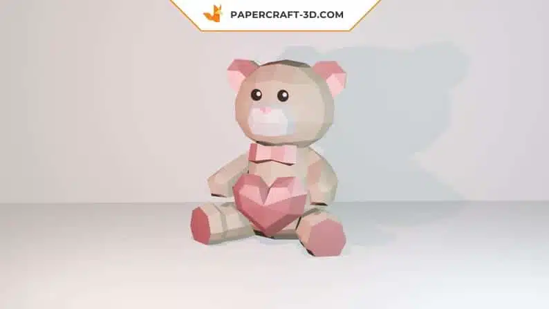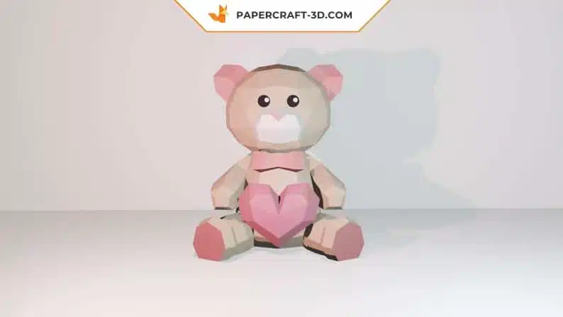 Une fois assemblé, l’ours mesure 350 mm de hauteur, 318 mm de largeur et 230 mm de profondeur. Le modèle est réparti sur 16 feuilles imprimées, avec des teintes distinctes pour le corps et le cœur, afin de renforcer le contraste visuel.