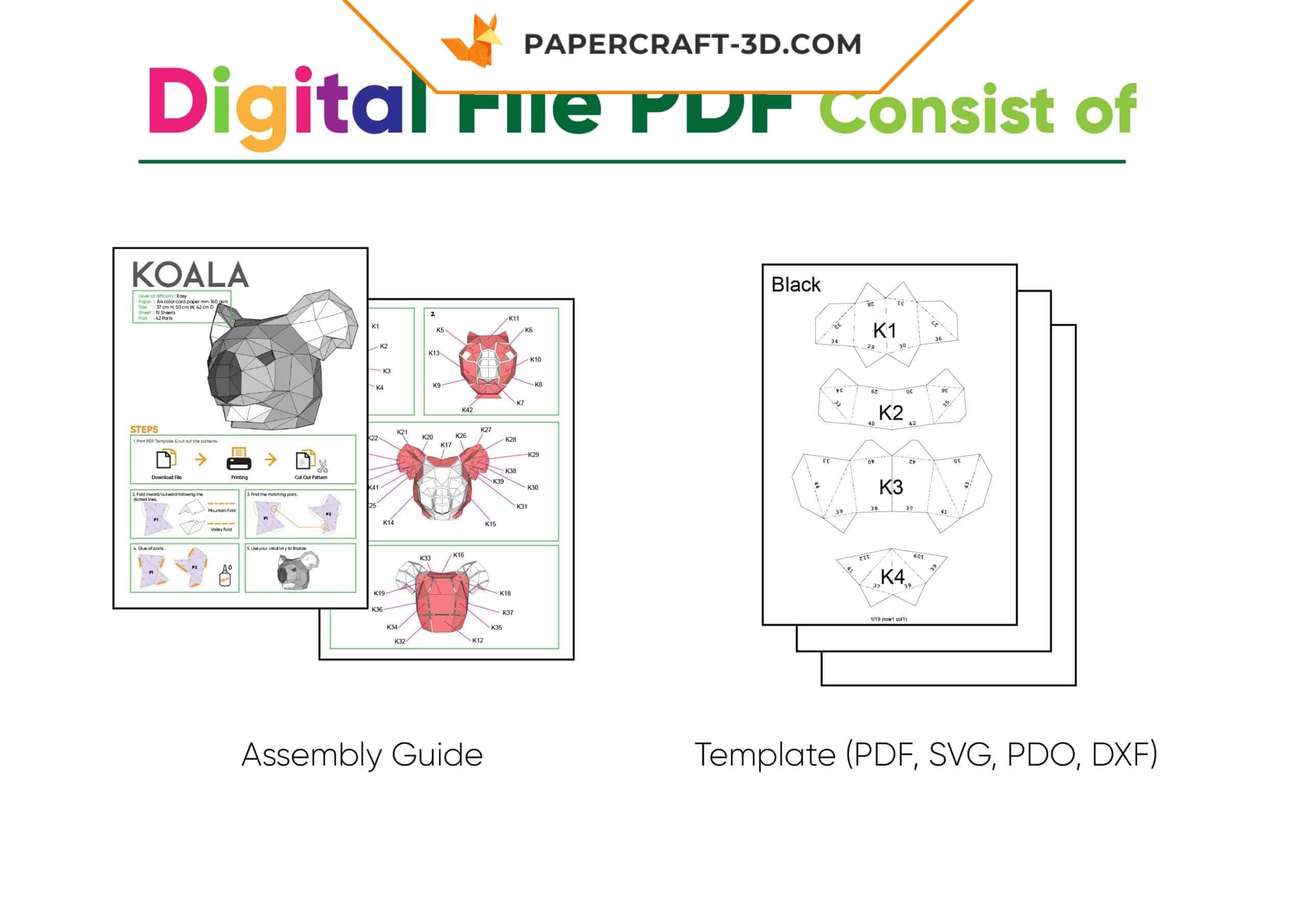 Ce masque de koala trouve naturellement sa place sur un mur ou posé comme une sculpture. Et si l’envie vous prend de composer un ensemble graphique, laissez-vous inspirer par la collection de papercraft 3D pour prolonger le plaisir et varier les formes, toujours avec la même fierté du résultat.