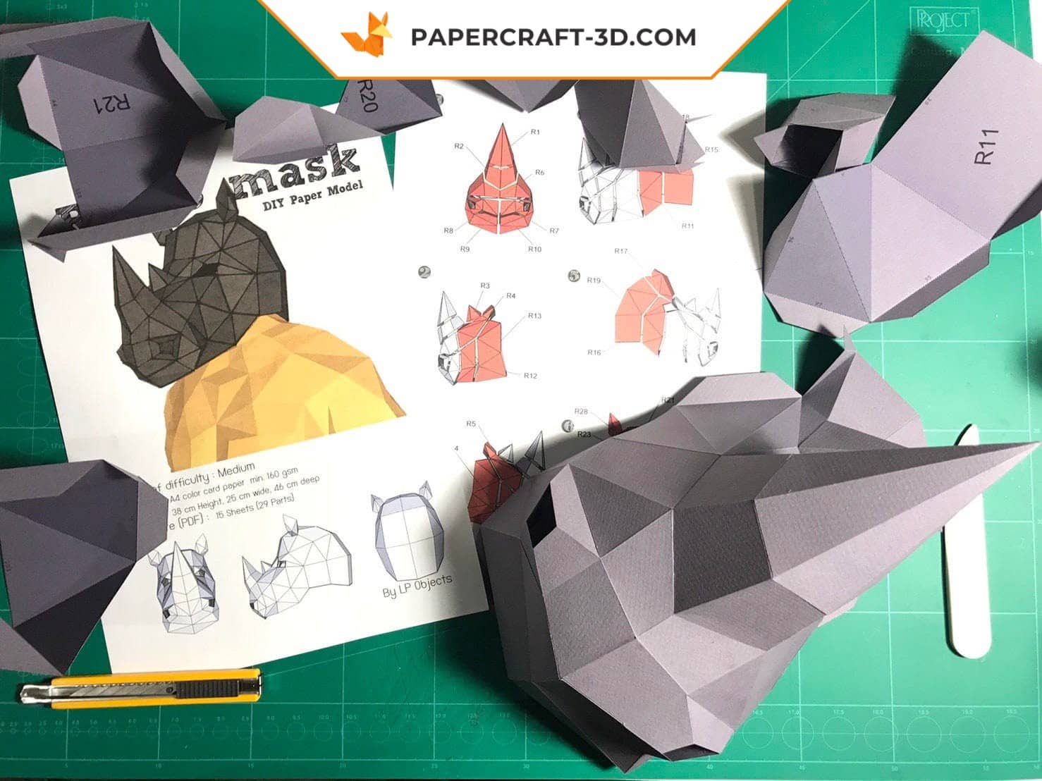 Le modèle comprend 15 pages de patrons pour 28 pièces à assembler. Le masque final mesure 340 mm de hauteur, 230 mm de largeur et 420 mm de profondeur.
