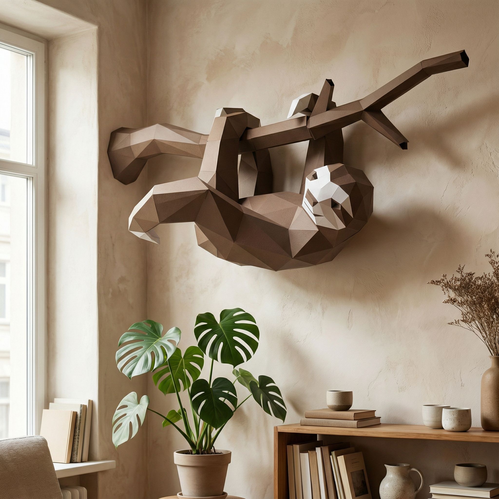 Accroché à sa branche, ce paresseux semble avoir arrêté le temps. Feuille après feuille, vous voyez naître une silhouette polygonale apaisante, à la fois graphique et chaleureuse.