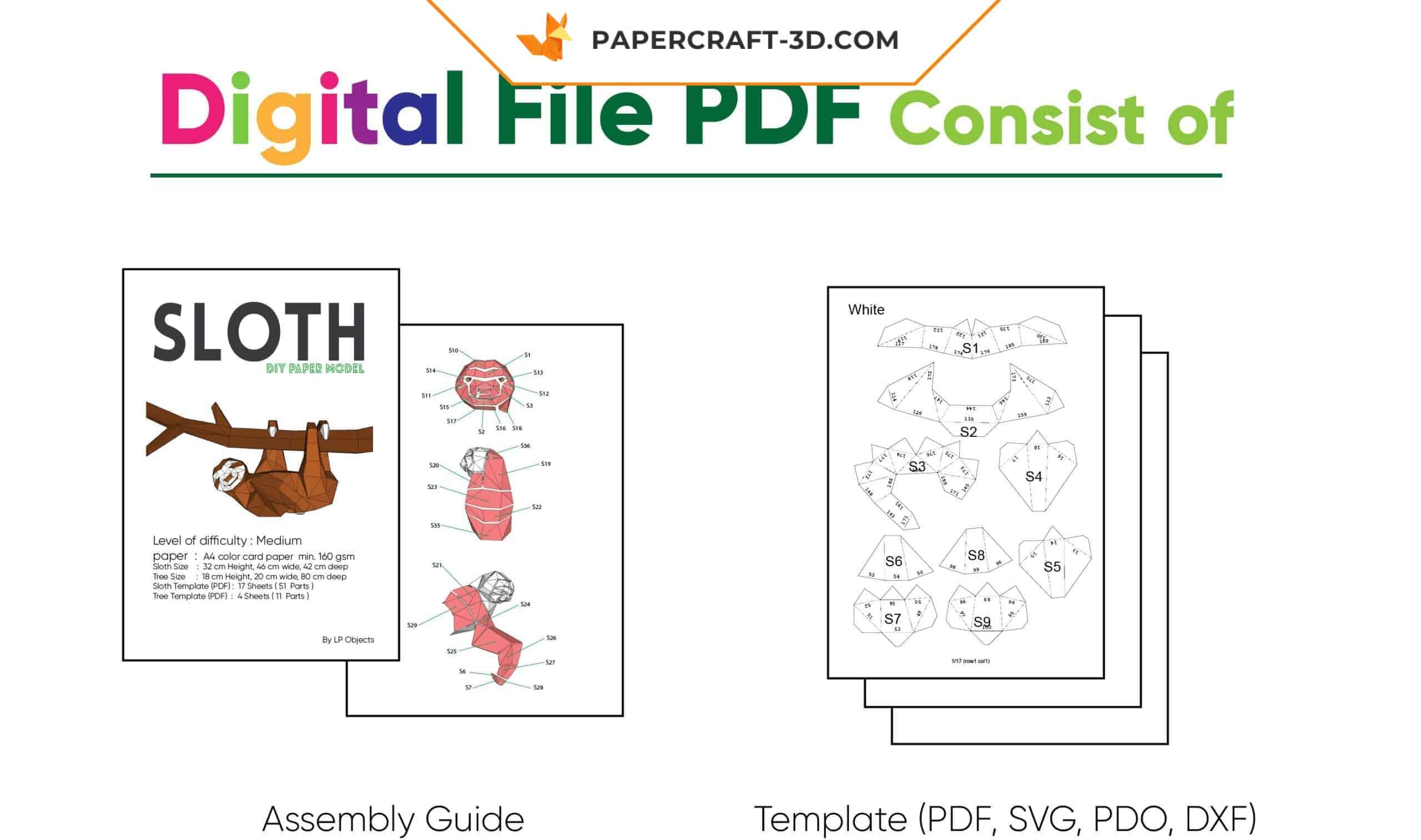 L’ensemble mesure 32 cm de hauteur, 46 cm de largeur et 42 cm de profondeur. Il comprend 21 feuilles imprimées prêtes à l’emploi : 17 feuilles pour le paresseux (51 pièces) et 4 feuilles pour la branche (11 pièces).