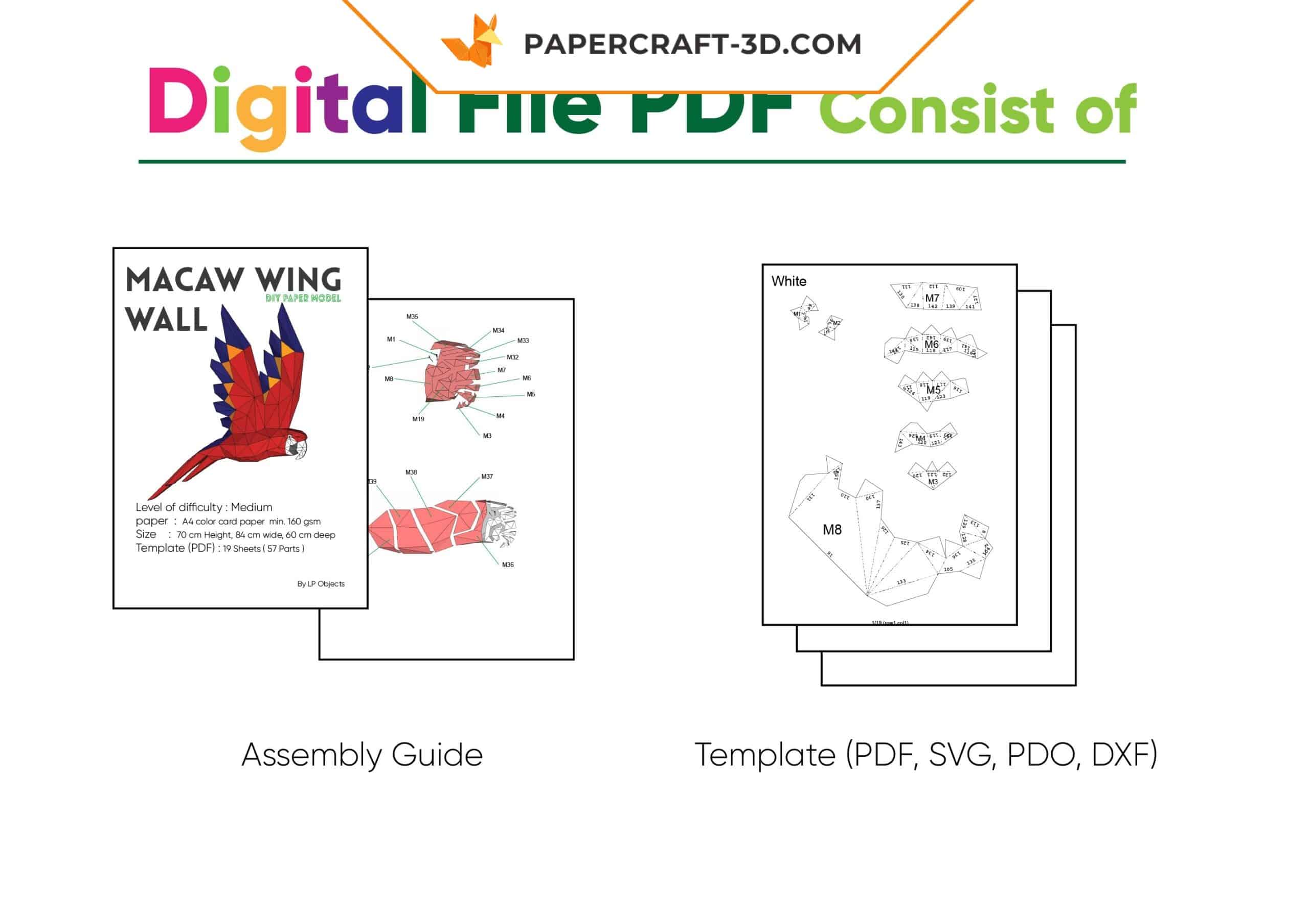 Une fois montée, l’aile de perroquet atteint 700 mm de hauteur, 840 mm de largeur et 600 mm de profondeur. Le modèle se compose de 19 feuilles pour un total de 57 pièces, pensées pour un assemblage fluide.