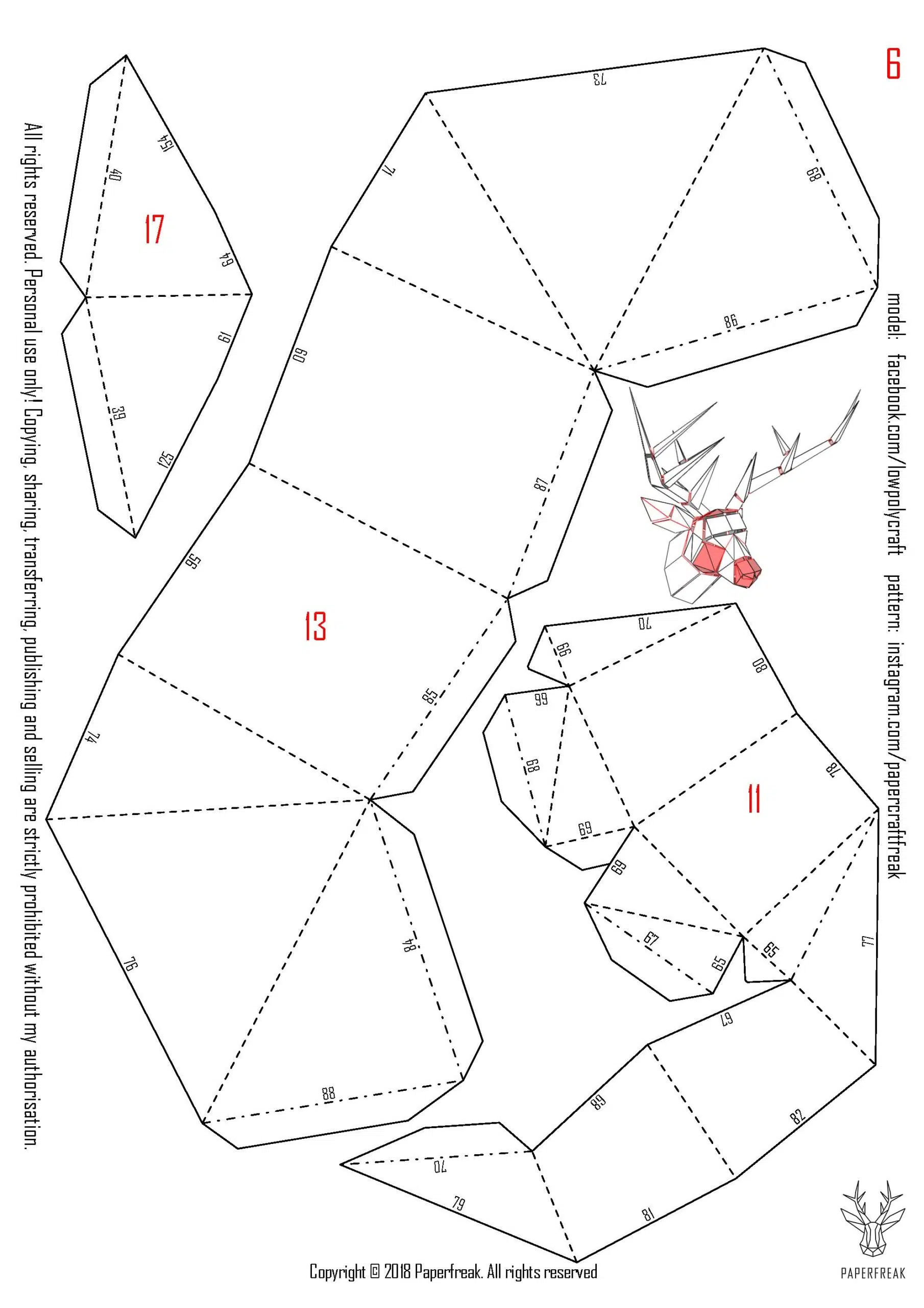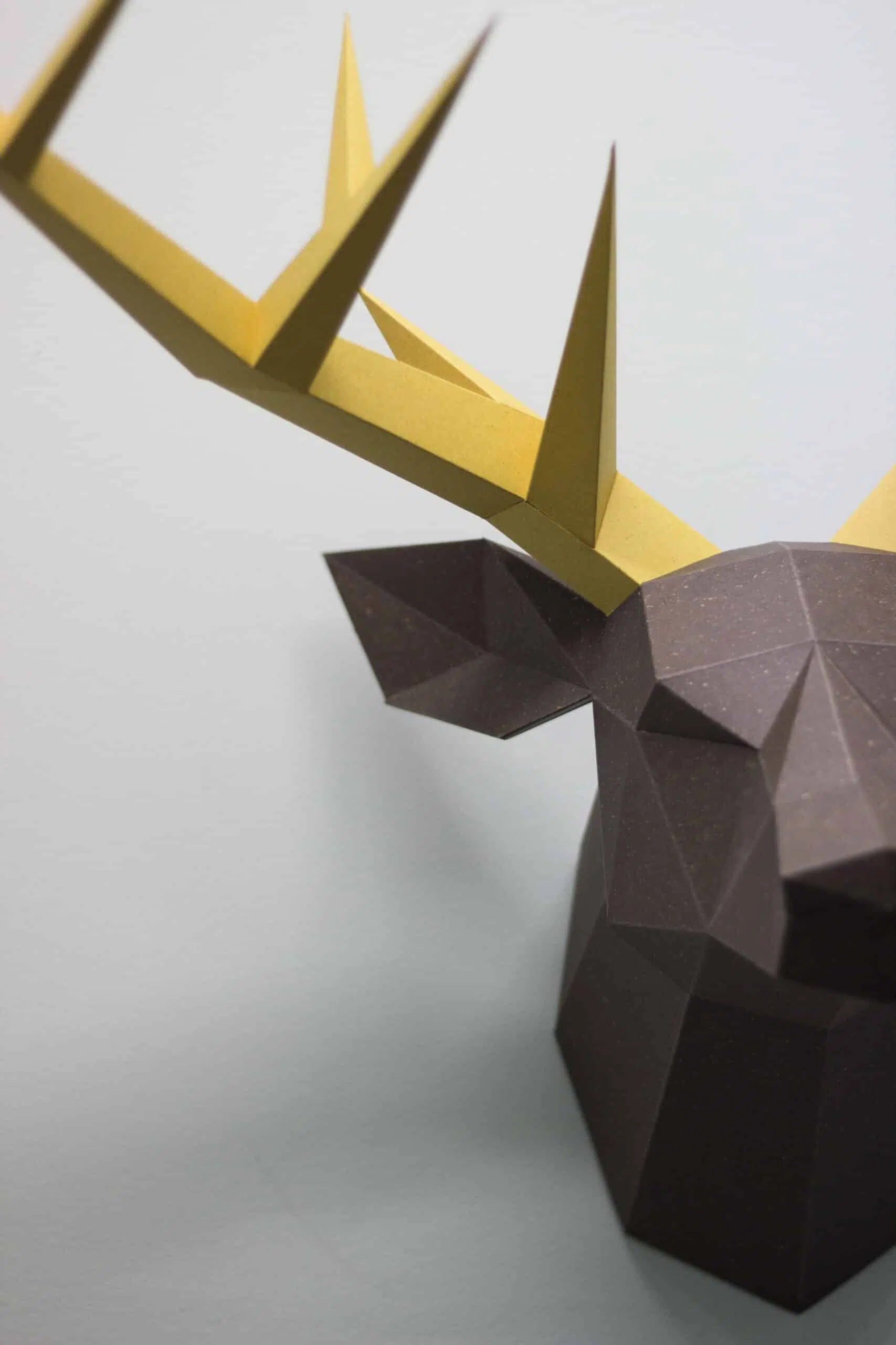 Le modèle se compose de 13 feuilles imprimées, à partir desquelles vous réalisez une tête de cerf de 600 mm de hauteur, 638 mm de largeur et 397 mm de profondeur. Le rendu est volontairement monochrome, pour mettre en valeur les volumes et les lignes.