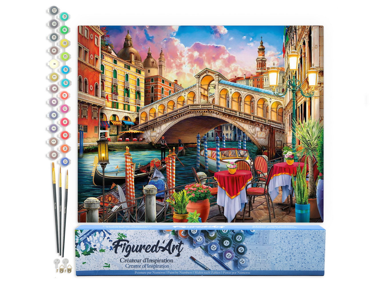 Vous déroulez la toile, les chiffres apparaissent, les couleurs attendent. Peu à peu, le Pont du Rialto prend vie sous vos pinceaux. La peinture par numéros transforme un moment calme à la maison en une vraie escapade créative.