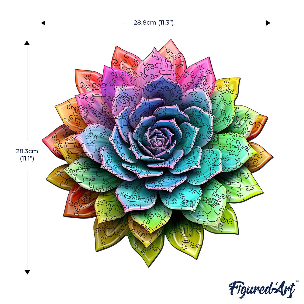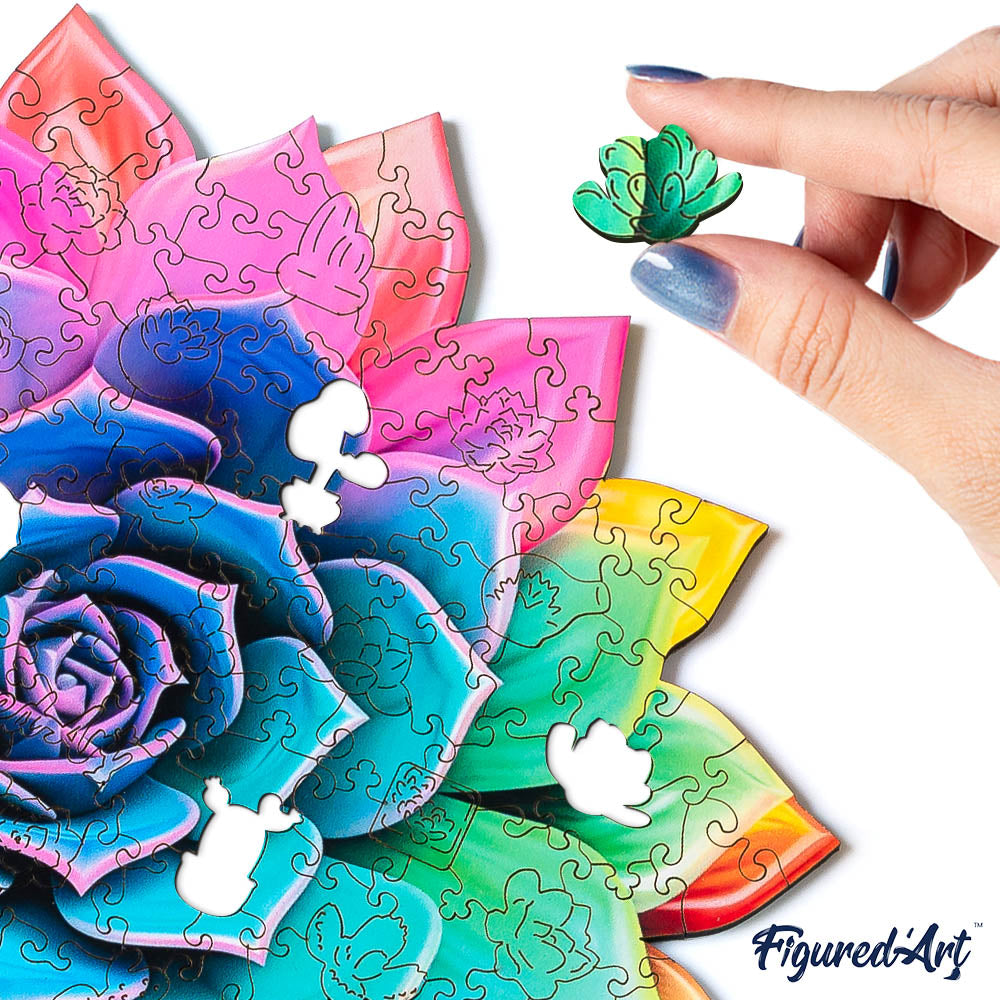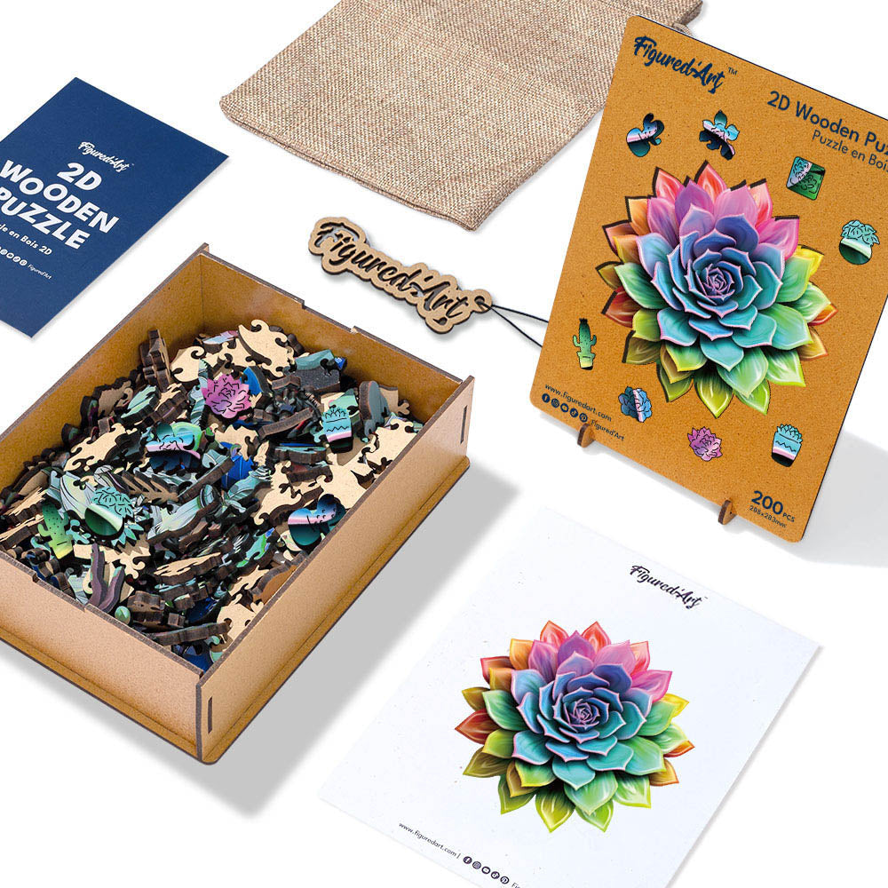 Vous ouvrez le coffret, les pièces en bois révèlent leurs formes surprenantes et leurs teintes vibrantes. Peu à peu, la succulente arc-en-ciel prend vie sous vos doigts. Ce Puzzle invite à ralentir, à savourer chaque assemblage, dans une ambiance calme et joyeuse.