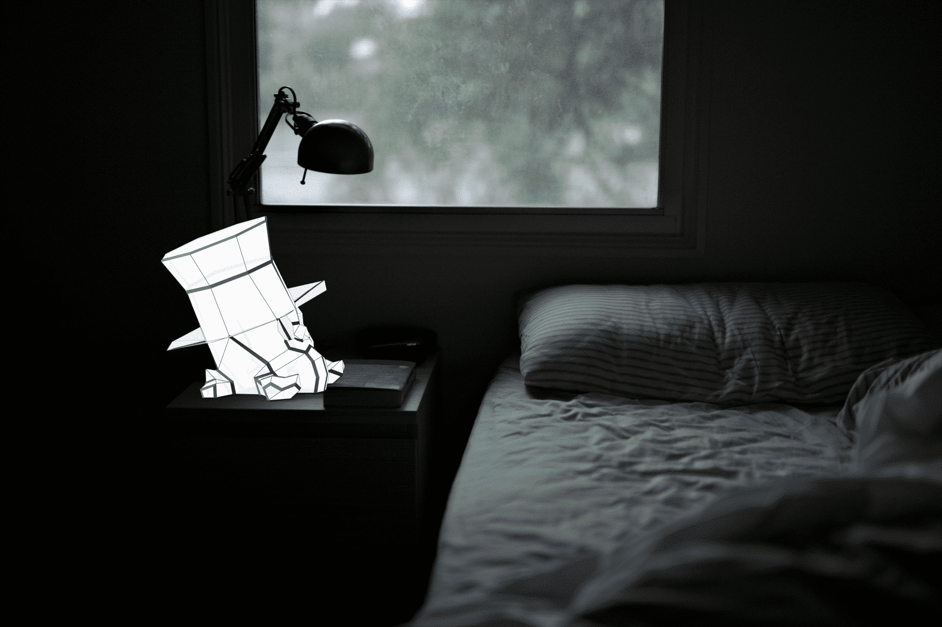 Éteinte, elle se dévoile comme une sculpture géométrique. Allumée, elle révèle tout le plaisir du papercraft 3D : construire de ses mains un objet décoratif fort, puis être fier du résultat une fois la dernière pièce en place.