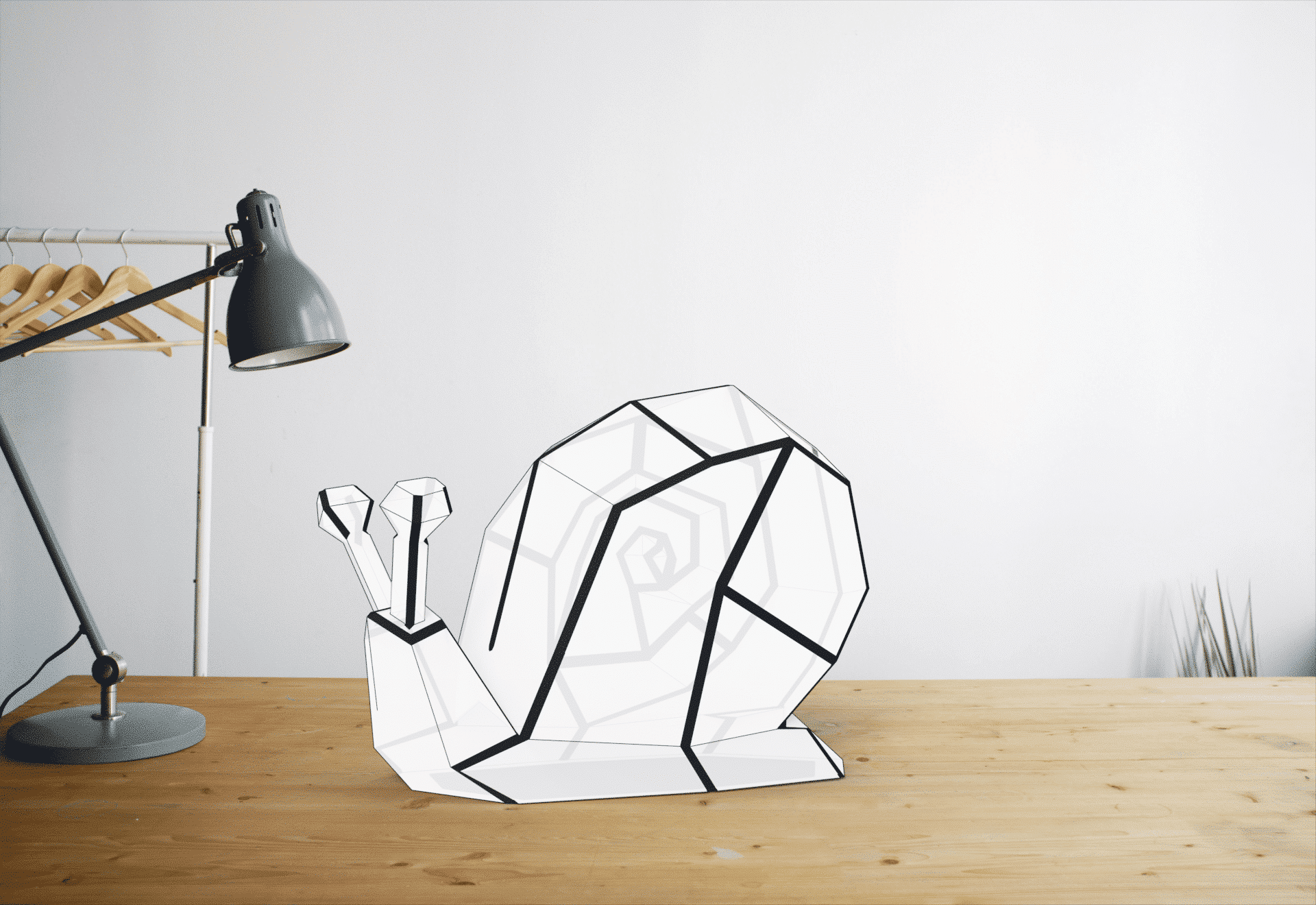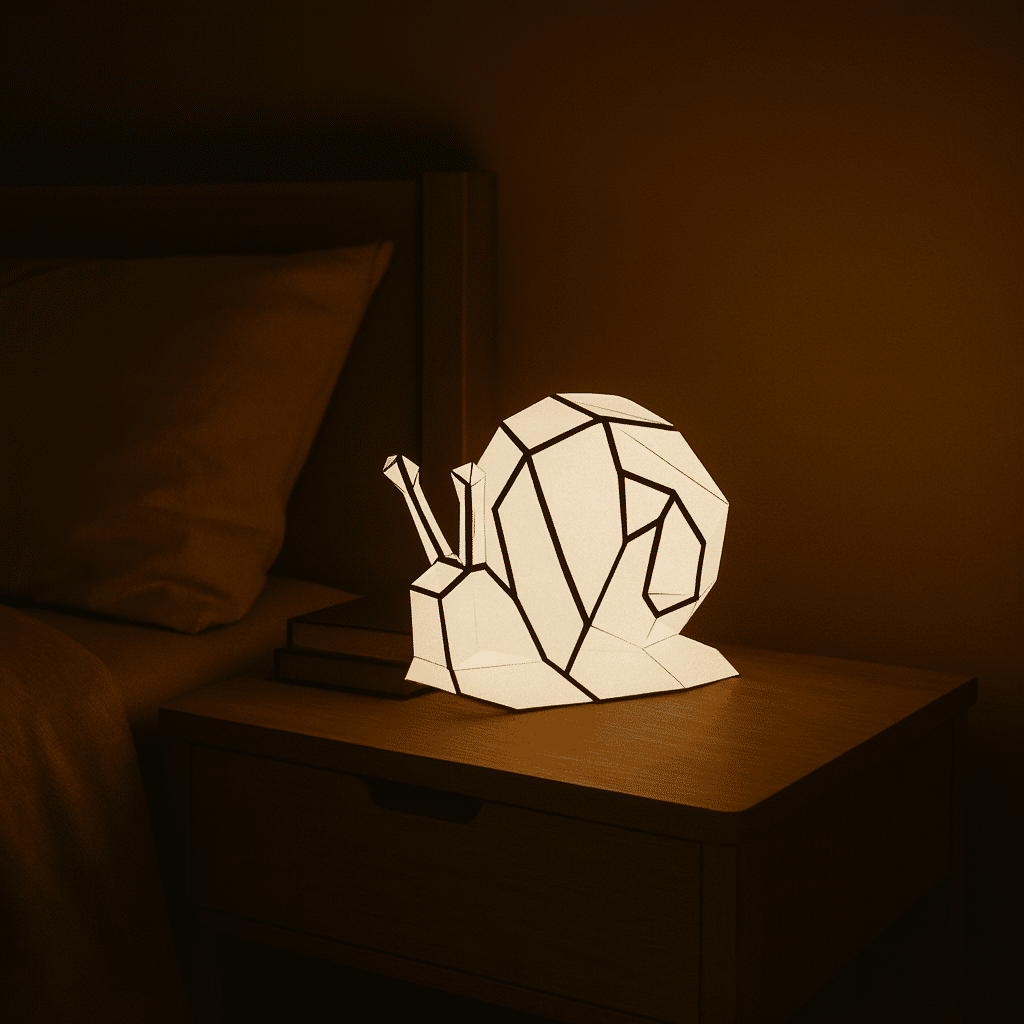 Posé sur une table de chevet ou une étagère, cet escargot semble avancer à son rythme, tranquille. Sa coquille en facettes capte la lumière et la diffuse avec douceur. Allumée, la veilleuse rassure. Éteinte, elle devient un bel objet déco, graphique et apaisant.