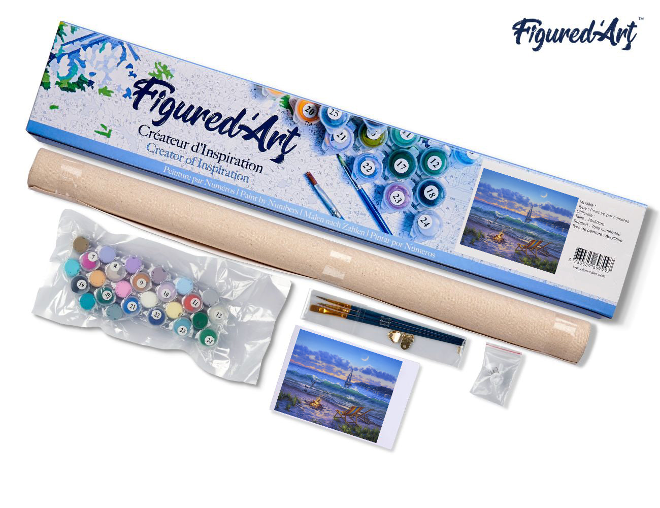 Le kit inclut une toile en lin numérotée de 40 x 50 cm, des pots de peinture acrylique numérotés, trois pinceaux en nylon de tailles différentes, une photo miniature de référence et le nécessaire pour la fixation murale. Un kit complet pour vous concentrer uniquement sur le plaisir de peindre.